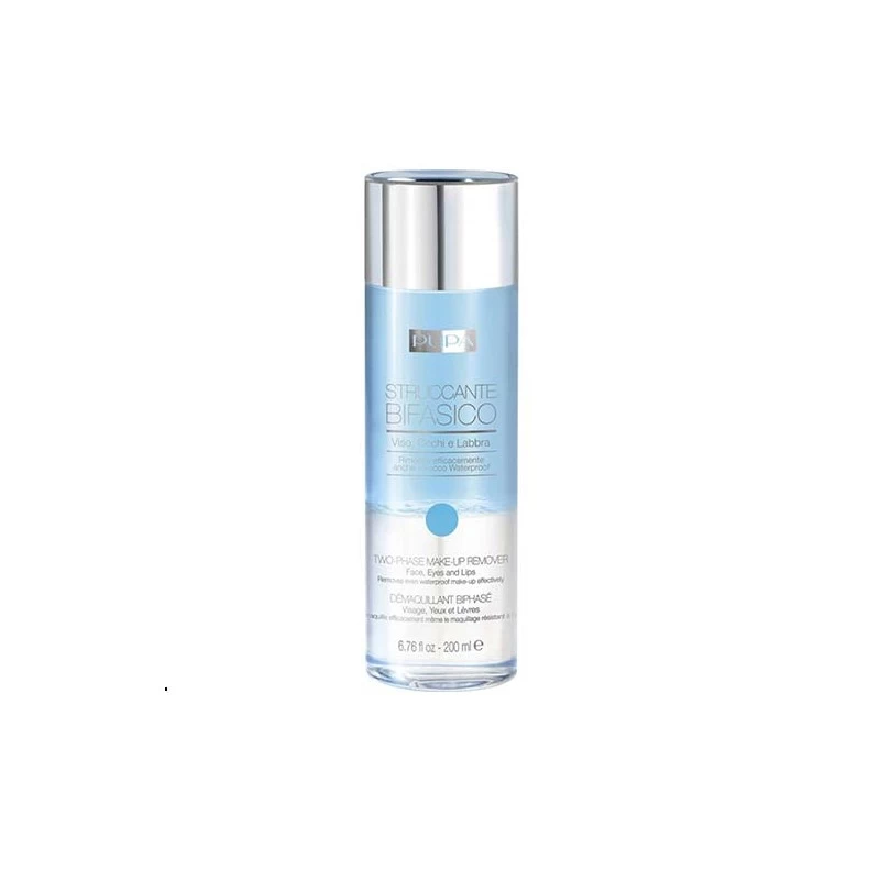 Le DÉMAQUILLANT visage de Pupa, grâce à sa composition BIPHASÉE, est idéal pour éliminer le maquillage résistant et waterproof rapidement et en douceur. Le démaquillant biphasé est composé de deux phases : une phase huileuse et une phase aqueuse. Lorsque vous agitez le flacon, ces deux phases sactivent à tour de rôle et forment une solution efficace.