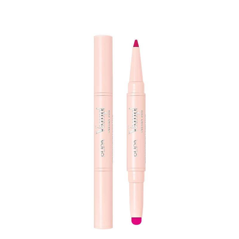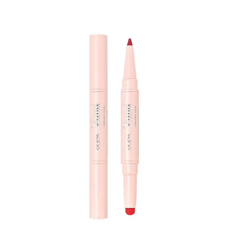 Un crayon qui définit et remodèle le contour des lèvres, un rouge à lèvres brillant et crémeux pour les rendre visiblement pleines et volumisées.